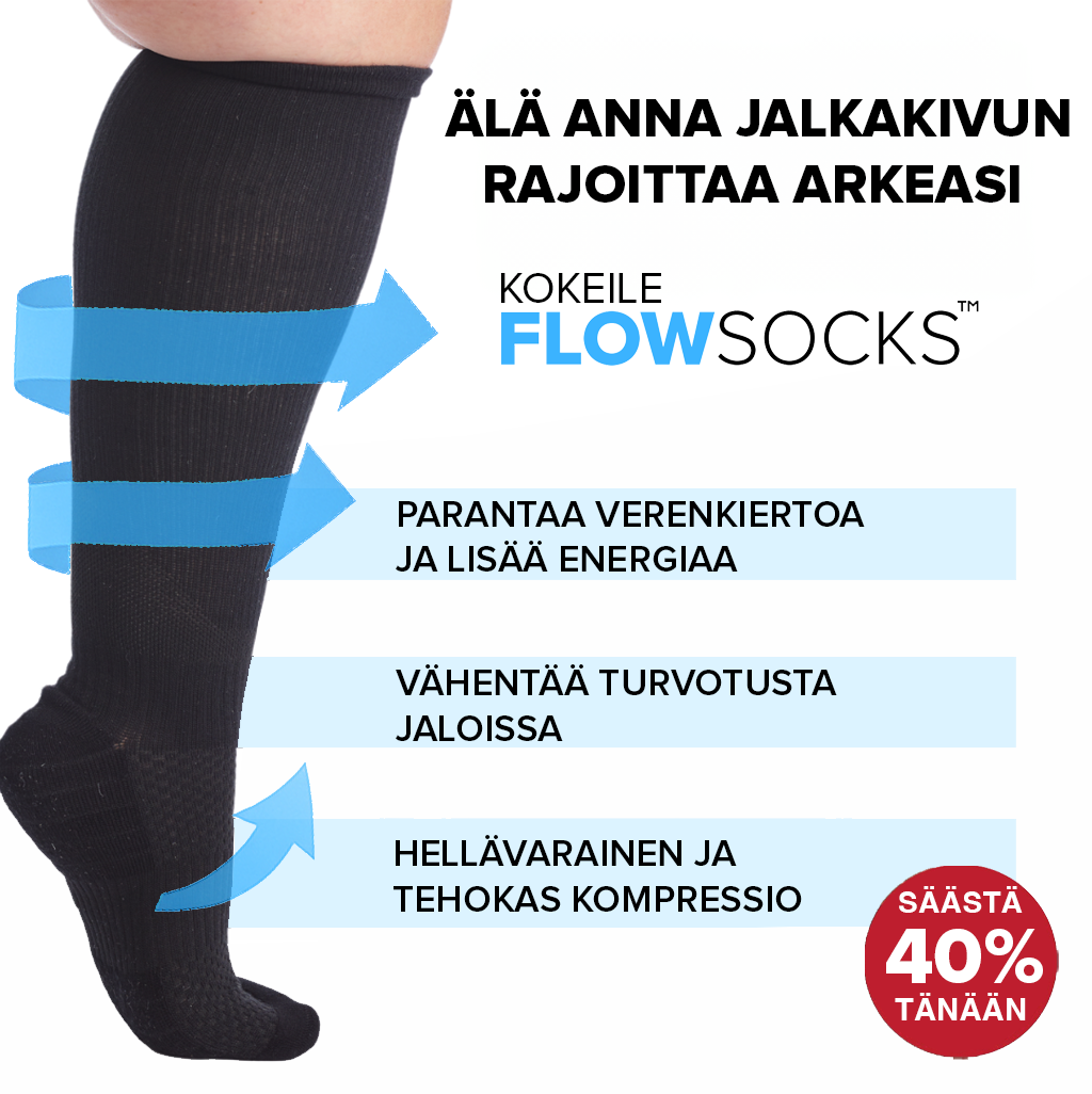 FlowSocks-sukat ovat todella hyvät! Olen käyttänyt niitä töissä, ja ne tarjoavat hyvän tuen ja ovat mukavat koko päivän.